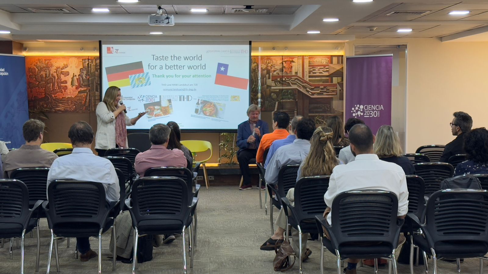 Pamela Valdivia Zárate, Directora Ejecutiva de la Oficina del Estado de Baviera para Sudamérica, destacó el valor humano de estos encuentros al afirmar que “la innovación y la colaboración son actividades profundamente humanas. Este tipo de meetups crea las condiciones para que personas con intereses comunes se conecten, generando una química que puede ser el inicio de proyectos conjuntos”. Destaca además el trabajo conjunto con Ciencia 2030, desarrollando este encuentro hace tres años y que ha propiciado las colaboraciones en proyectos con la universidad de Concepción. Además, subrayó la complementariedad entre Alemania y Chile en el desarrollo de energías renovables y la producción de hidrógeno verde.