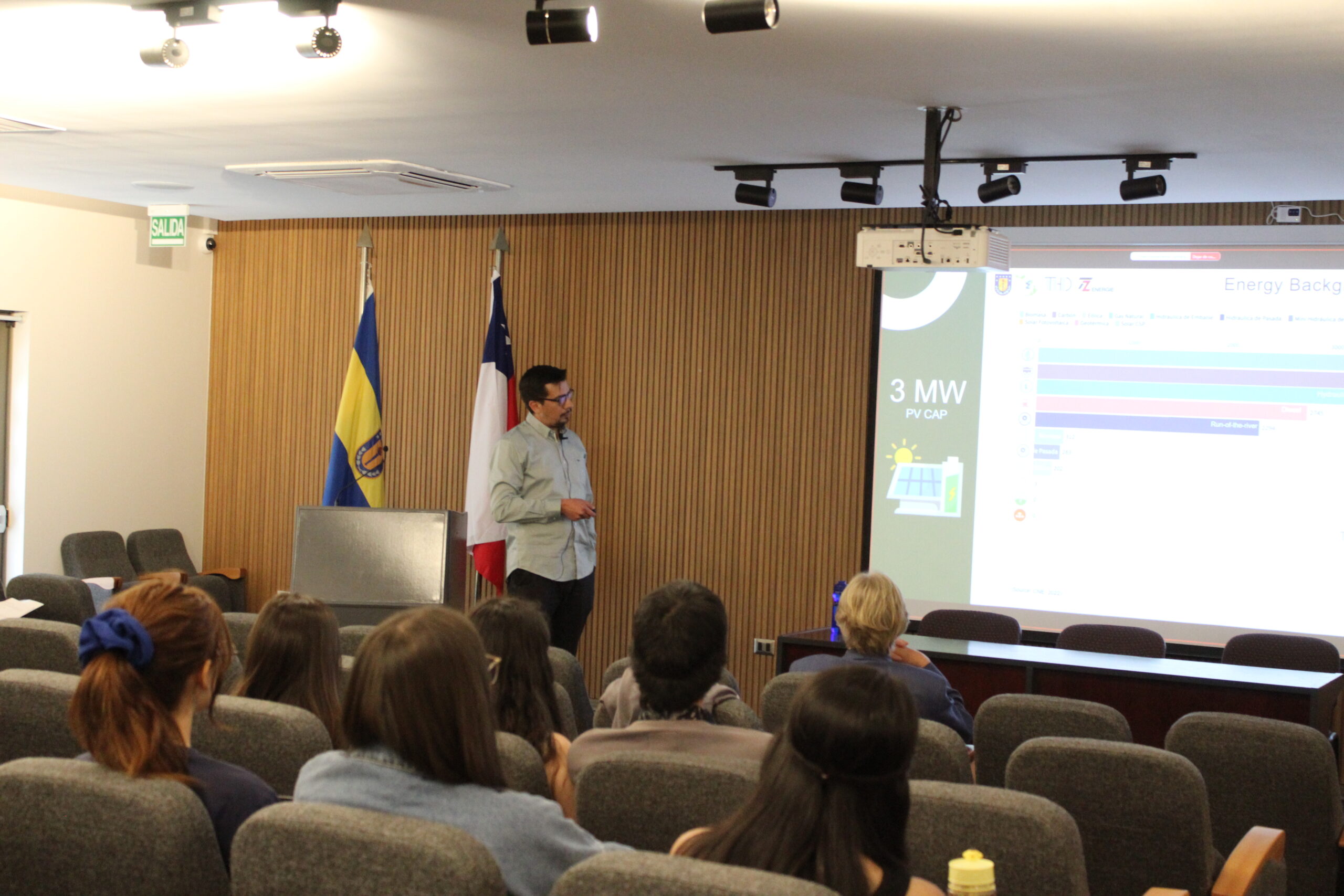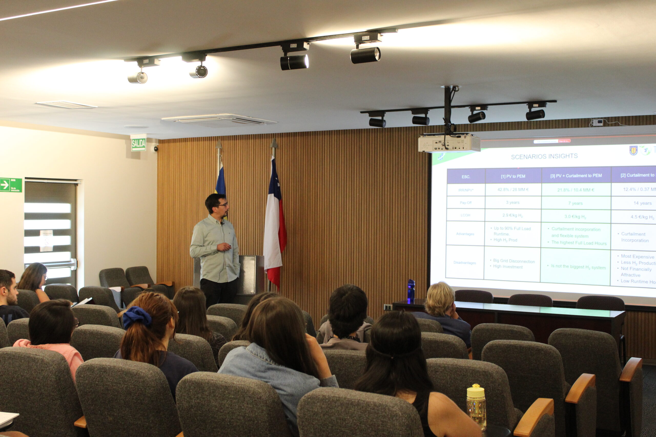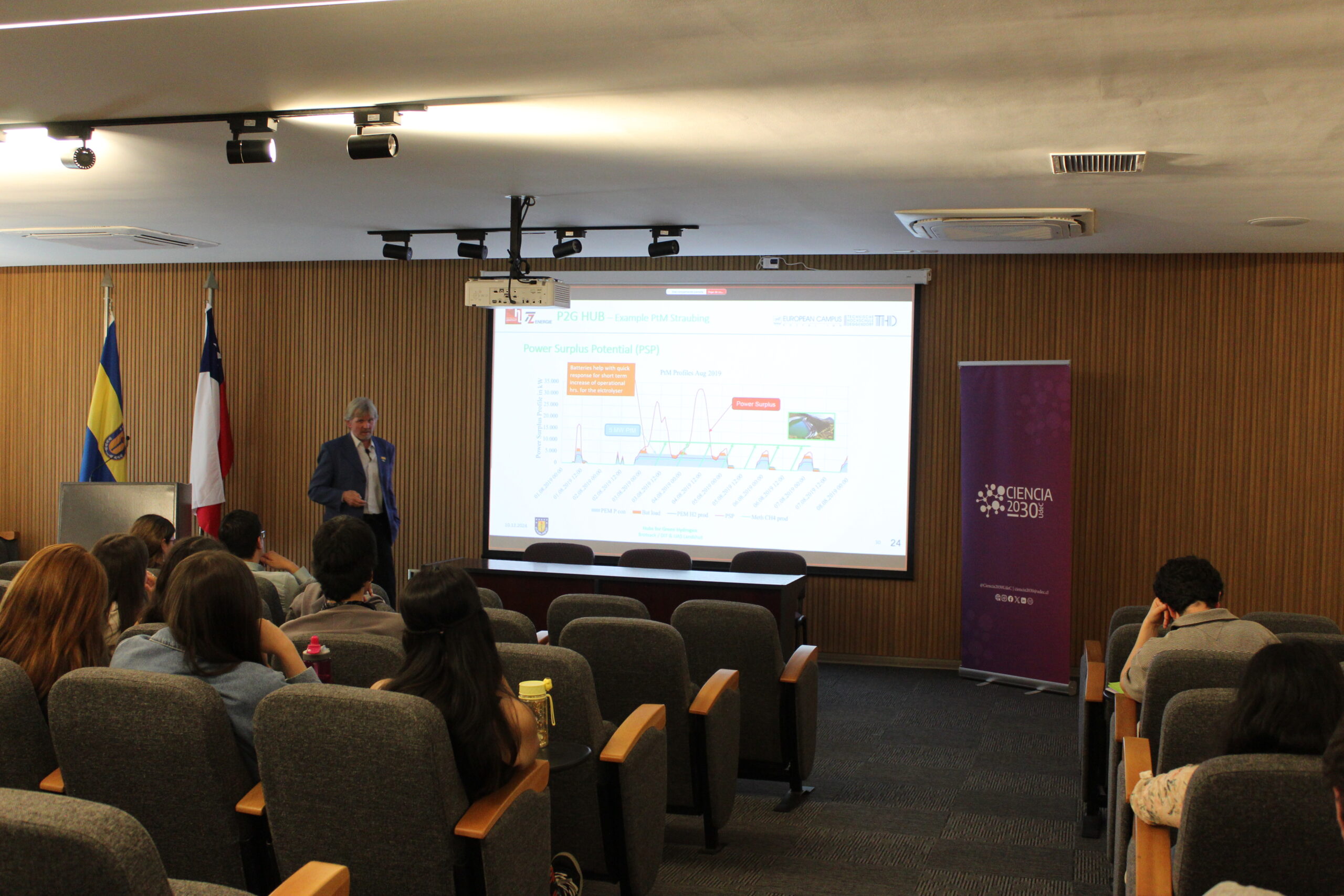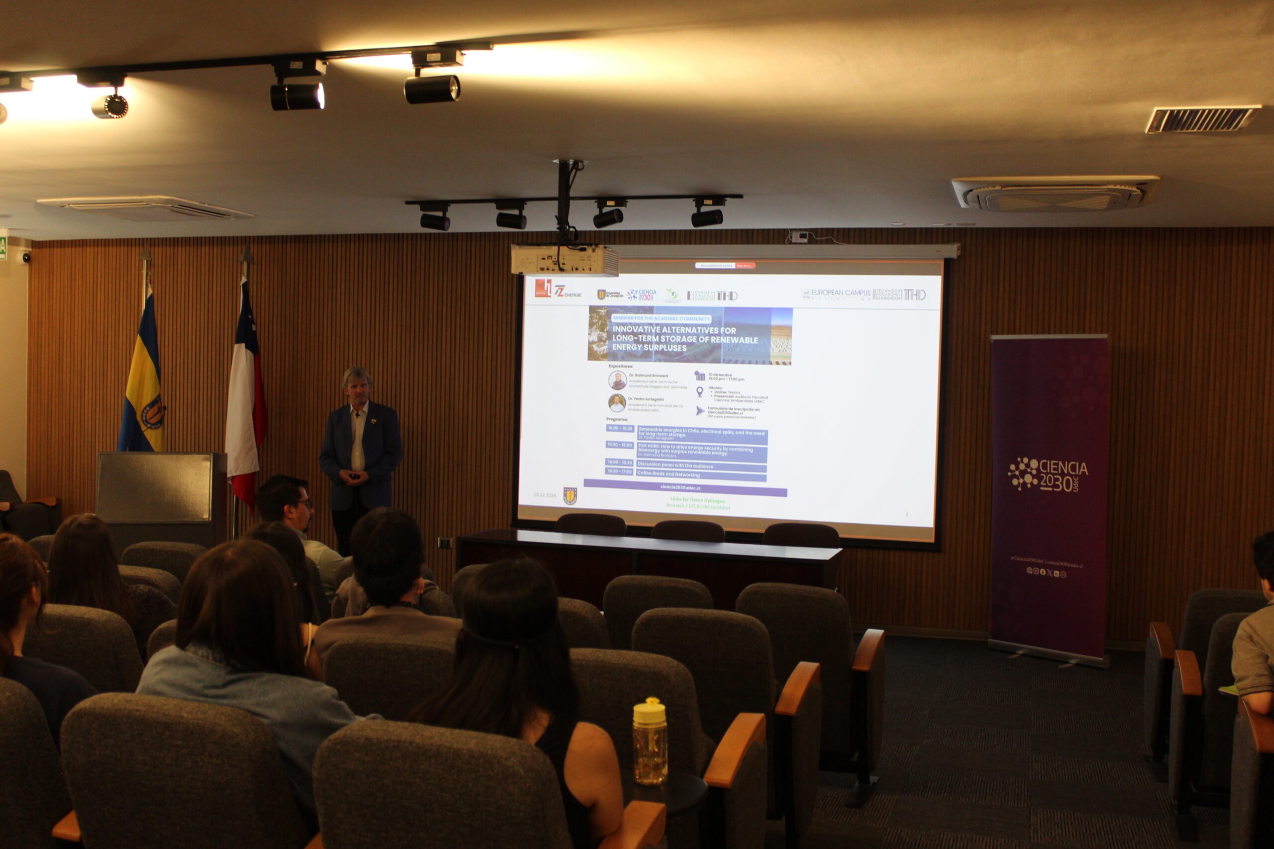 El seminario contó con la participación del Dr. Raimund Brotsack, del Deggendorf Institute of Technology quien presentó sobre la tecnología Power to Gas, destacando su potencial para transformar excedentes de energía en hidrógeno verde y biogás. Por su parte, el Dr. Pedro Arriagada, académico de la Facultad de Ciencias Ambientales Universidad de Concepción, analizó los retos asociados al almacenamiento energético a largo plazo en el contexto chileno.