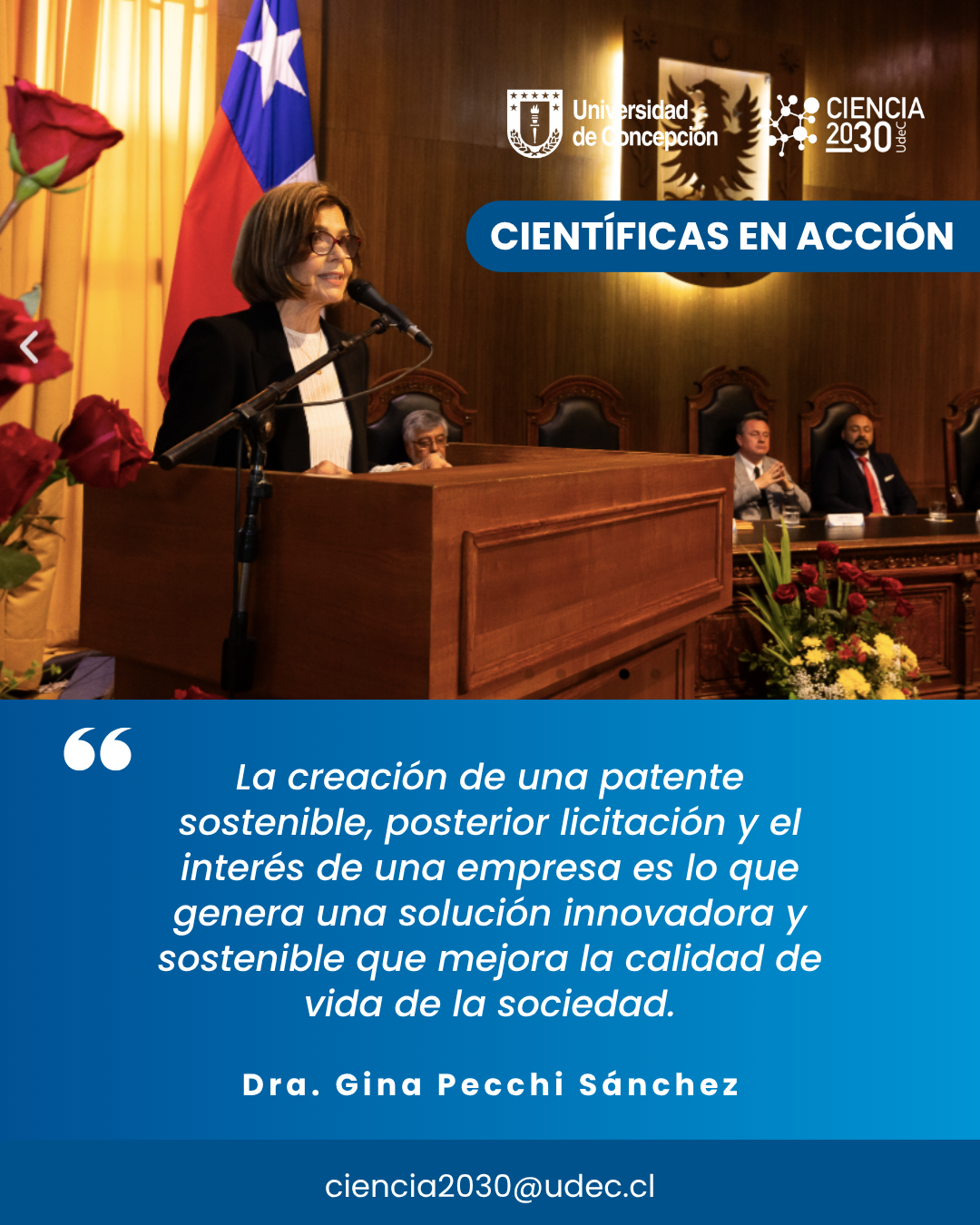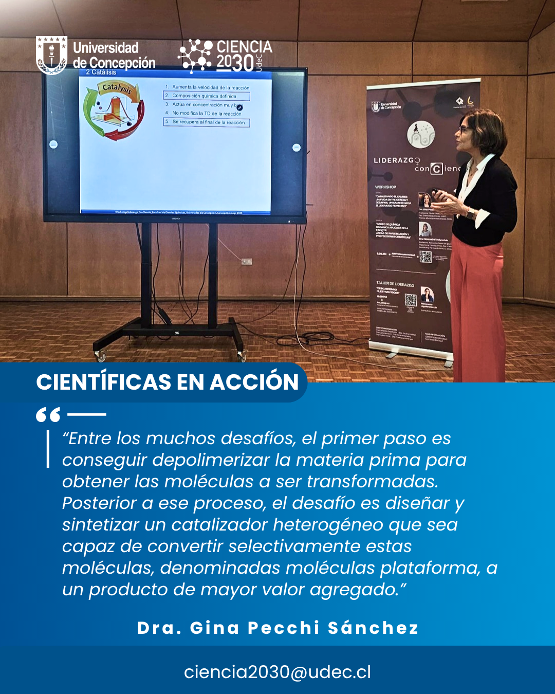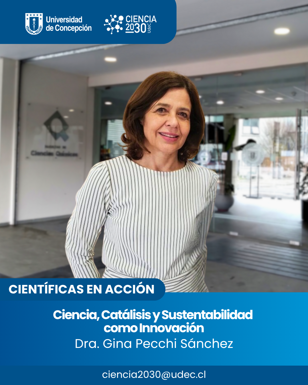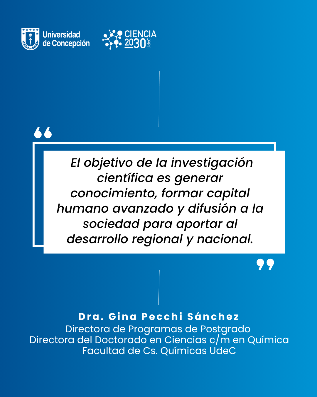 En el contexto de la iniciativa Ciencia 2030 de la UdeC, que busca articular la investigación con las necesidades del desarrollo regional y nacional, la Dra. Pecchi subraya la importancia de generar soluciones innovadoras y sostenibles para la sociedad. «El objetivo de la investigación científica es generar conocimiento, formar capital humano avanzado y difusión a la sociedad para aportar al desarrollo regional y nacional «, comenta la Directora de Programas de Doctorado de Cs. Químicas.