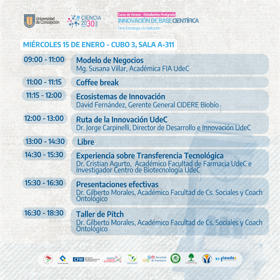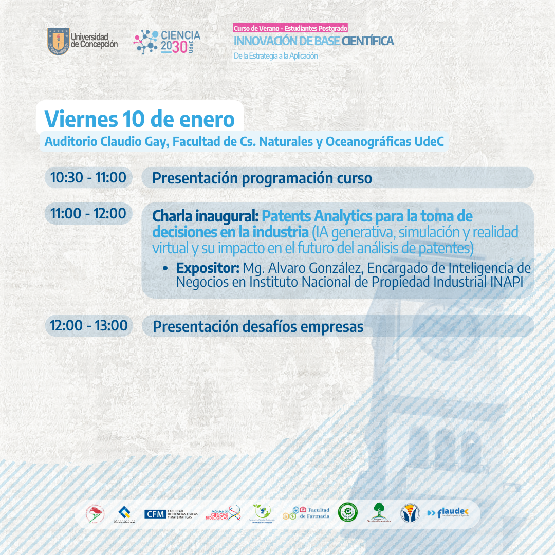 Te invitamos a ser parte del Curso de Verano 2025: Innovación de Base Científica – De la Estrategia a la Aplicación, una experiencia transformadora diseñada exclusivamente para estudiantes de Magíster y Doctorado de las 10 Facultades del Plan Ciencia 2030 UdeC.