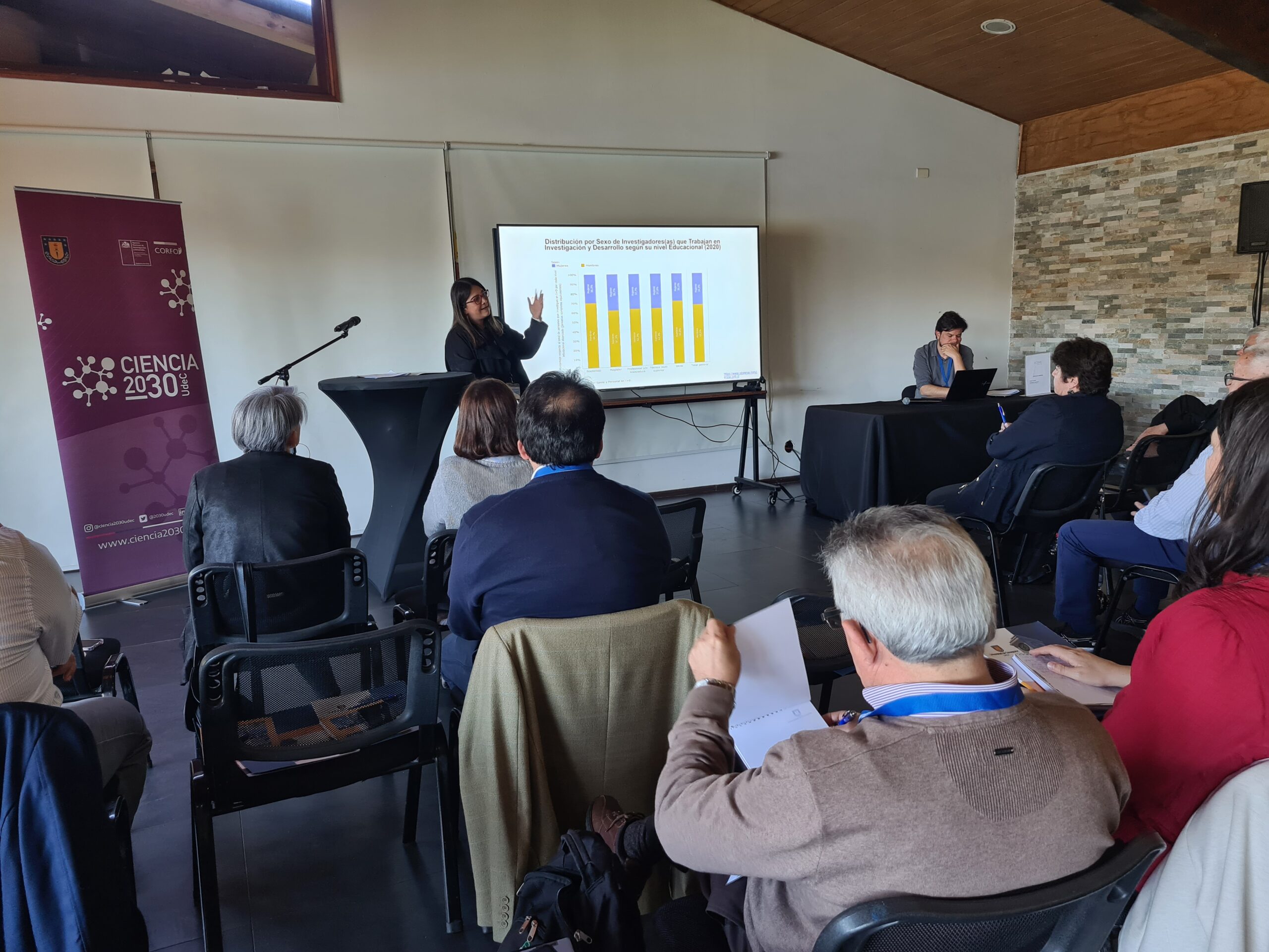 El primer día del evento concluyó con un conversatorio moderado por Roxana López y Pamela Sobarzo, Coordinadora de la Unidad de Formación del plan Ciencia 2030 UdeC. En este espacio participativo, las Decanas y Decanos fueron protagonistas, buscando transformar las discusiones en acciones concretas y fomentar la implementación de iniciativas destinadas a abordar los desafíos planteados en la sesión sobre género e inclusión en la ciencia.