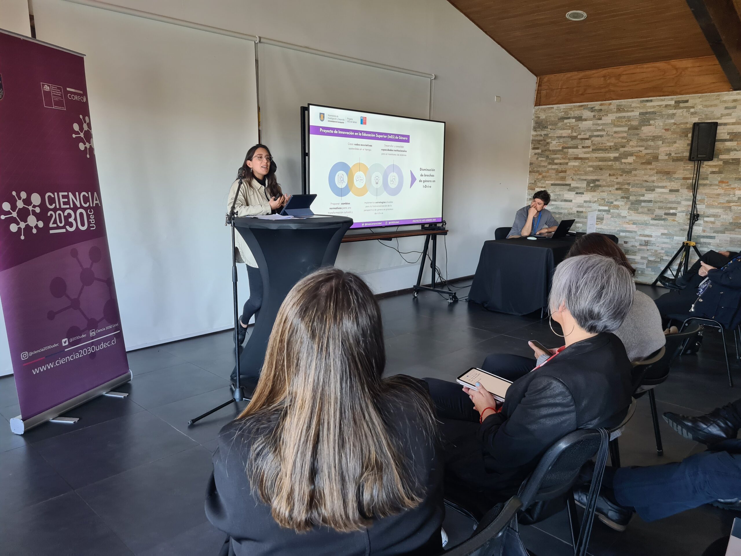 Después de un breve receso, la jornada se enfocó en la Sesión 1: «Género e Inclusión en la Ciencia», abordando temas cruciales para el progreso de la equidad en el ámbito científico. La sesión contó con exposiciones de destacadas profesionales, entre ellas Roxana López, Gestora Tecnológica de Ciencia 2030 UdeC; Claudia Maldonado, del Proyecto INES Género; y Valentina Matus, de la Dirección de Equidad de Género y Diversidad Sexual de la Universidad de Concepción.