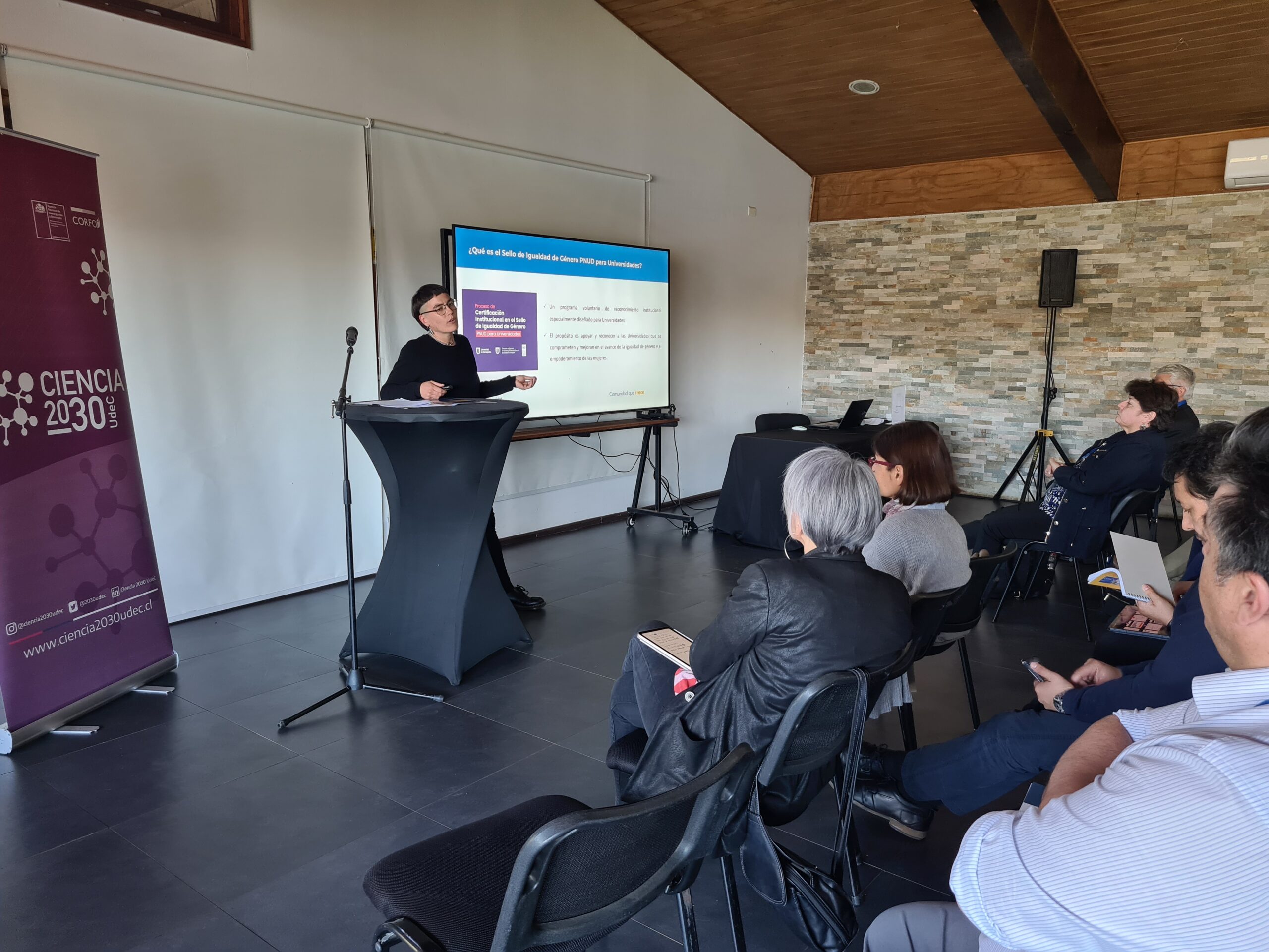 Finalmente, Valentina Matus explicó el proceso de certificación en el Sello de Igualdad de Género PNUD para Universidades, un programa voluntario de reconocimiento institucional. Este sello establece estándares en cinco dimensiones principales, que abarcan desde la planificación y gestión para la igualdad de género hasta la participación y alianzas, y los resultados e impactos de la producción de conocimiento.