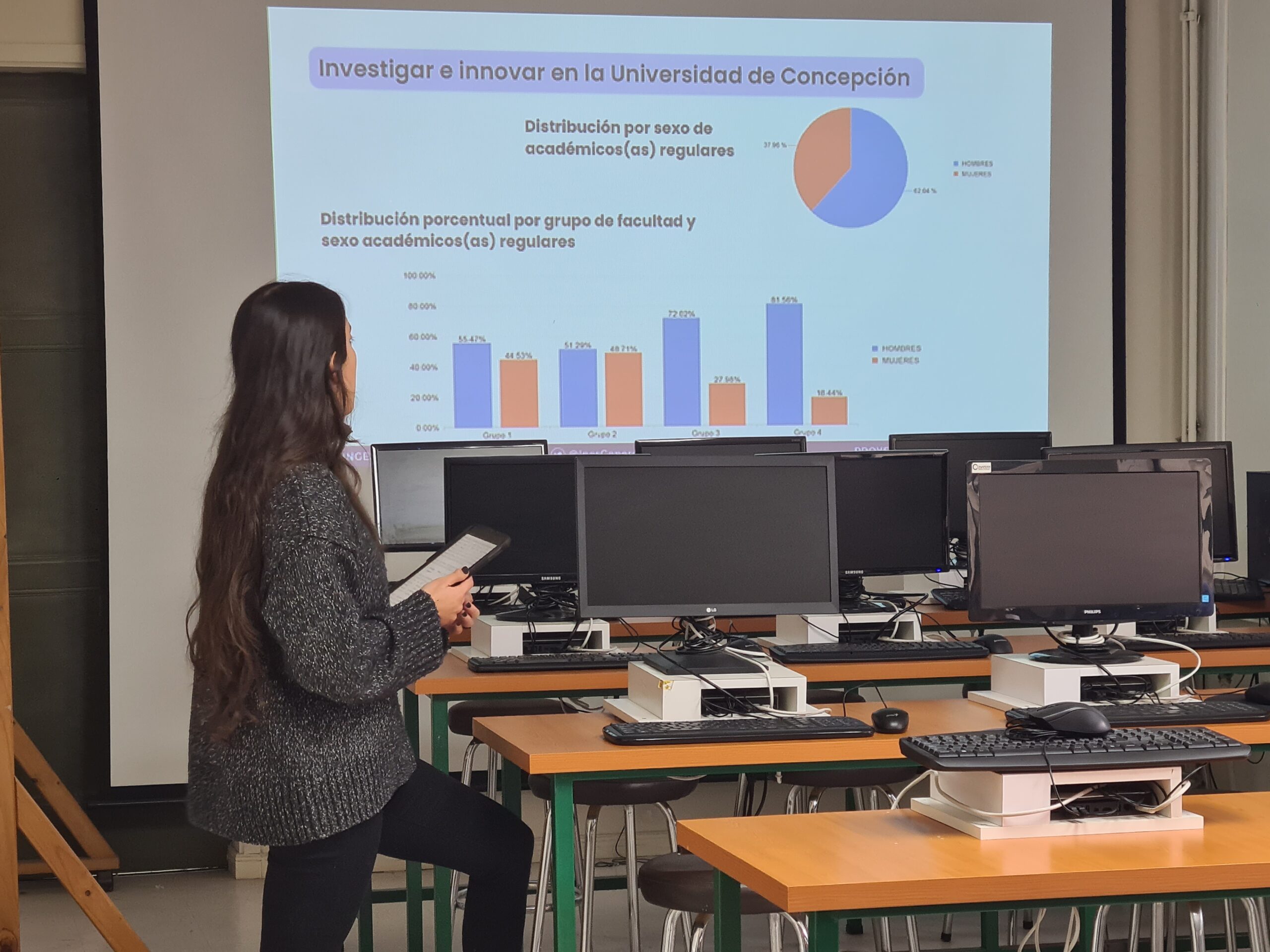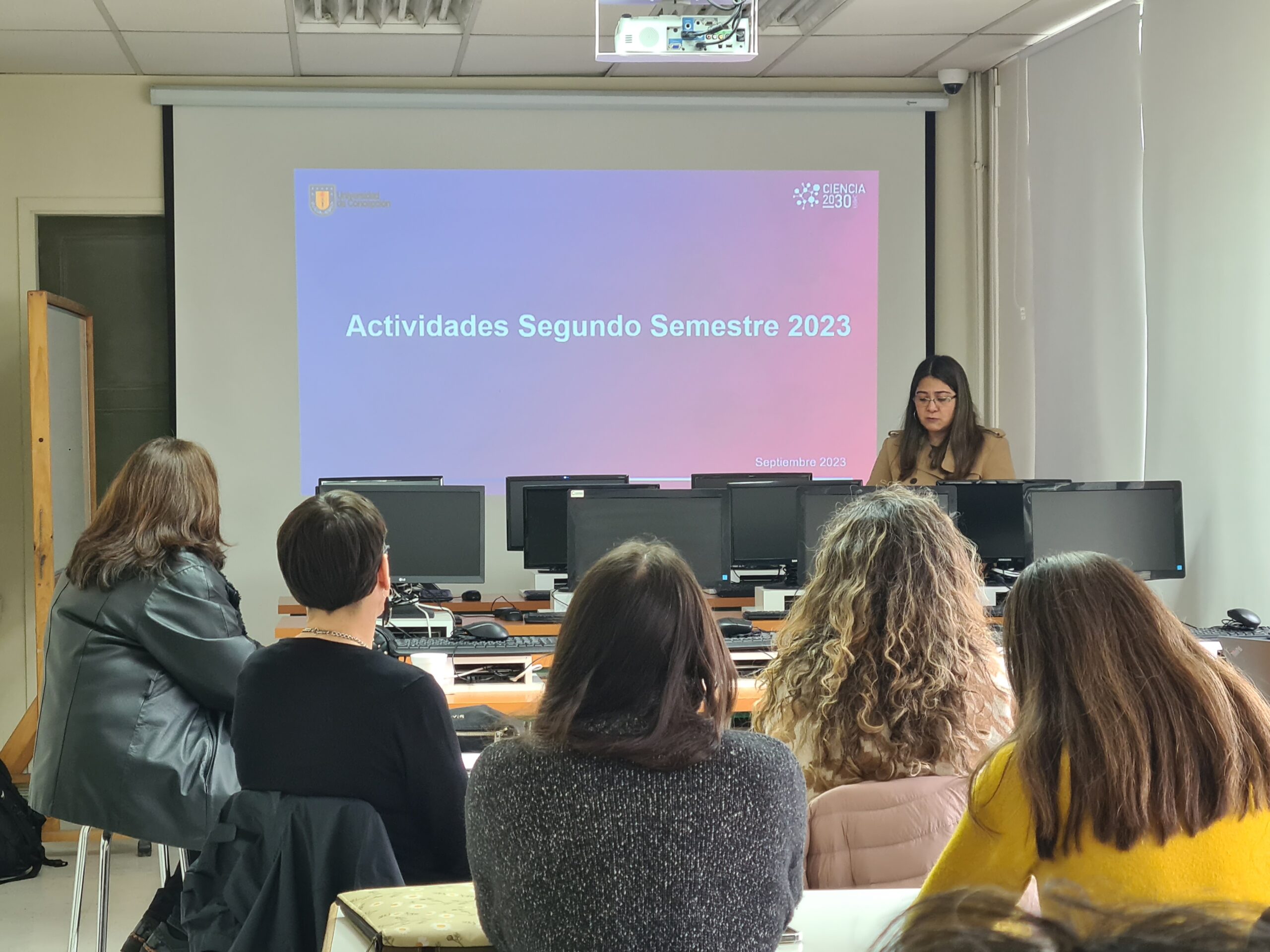 Luego, Roxana López, Gestora Tecnológica y Encargada del Eje Liderazgo Femenino de Ciencia 2030 UdeC, mostró las jerarquías de las docentes pertenecientes a las 10 Facultades de Ciencias Asociadas al plan estratégico. Además, presentó las actividades de género programadas para el segundo semestre de 2023.