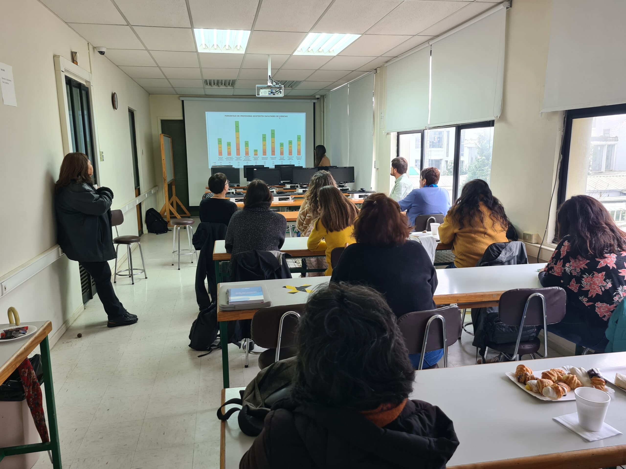 Posterior a la bienvenida, Claudia Maldonado, Profesional Área de Redes y Asociatividad Proyecto InES Género, compartió cifras preliminares sobre la situación y desafíos que enfrentan las académicas en el ámbito científico dentro de la universidad.