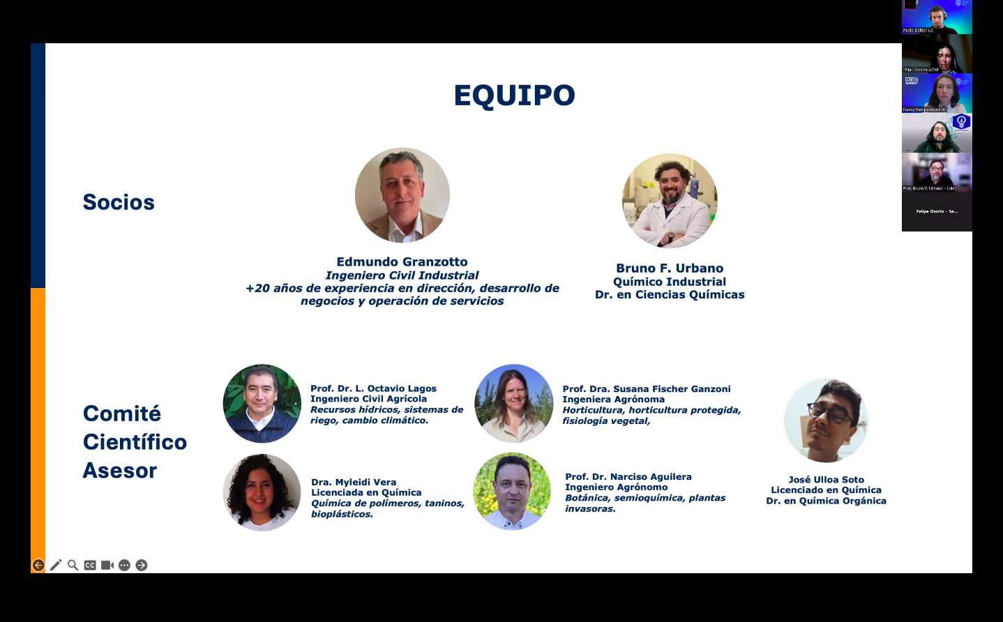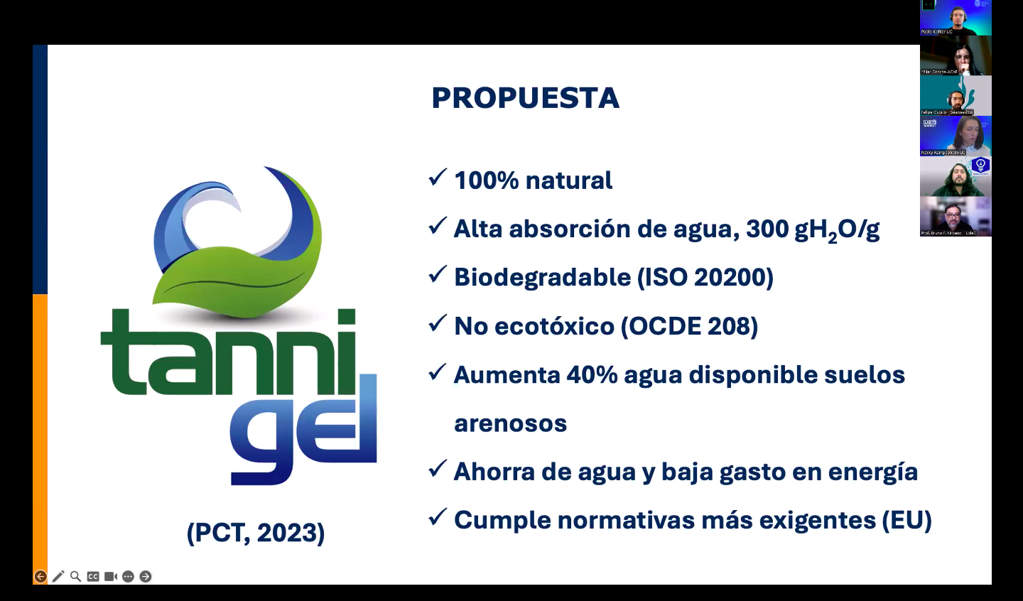 En representación de la UdeC, el Dr. Bruno Urbano presentó su emprendimiento Tannigel y como este producto enfrenta el impacto de la escasez hídrica y el cambio climático, que han reducido los rendimientos agrícolas —como el trigo y el maíz— hasta en un 40% entre 1980 y 2015. Además, señaló que la agricultura representa cerca del 70% del consumo de agua a nivel mundial. En este contexto, explicó que los superabsorbentes —materiales capaces de retener grandes cantidades de agua— se presentan como una alternativa para reducir la frecuencia de riego. Sin embargo, los superabsorbentes disponibles actualmente son sintéticos, derivados del petróleo, no biodegradables y potencialmente contaminantes para el suelo.